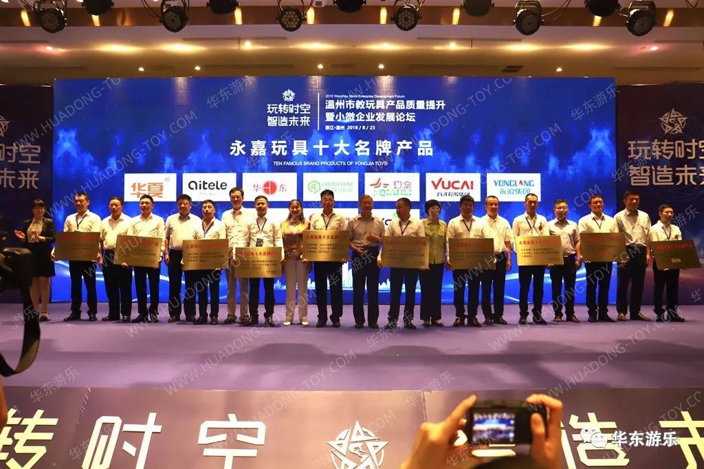 首届“永嘉玩具十大名牌产品”评选结果也在论坛上正式揭晓。奇特乐集团有限公司、育才控股集团有限公司、凯奇集团有限公司、永浪集团有限公司、浙江巧巧教育科技有限公司、立本集团有限公司、华夏游乐有限公司、银河游乐设备有限公司制造的无动力类小型游乐设施产品以及贝旺玩具有限公司、浙江潜力玩具有限公司制造的塑胶玩具产品被评为“永嘉玩具十大名牌产品”。