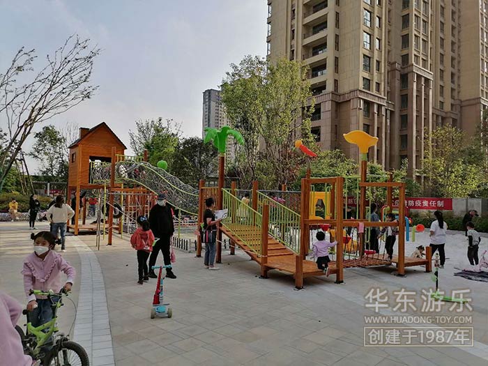 该项目采用非标定制木制工艺,有滑梯、沙池、传声筒 、爬网已经音乐系列的敲打设备,整体设计完美,符合房地产整体规划。