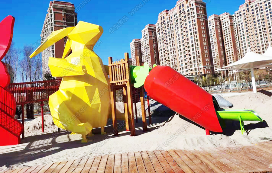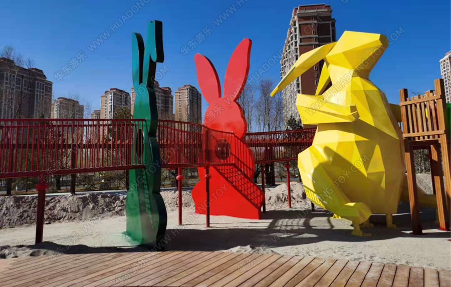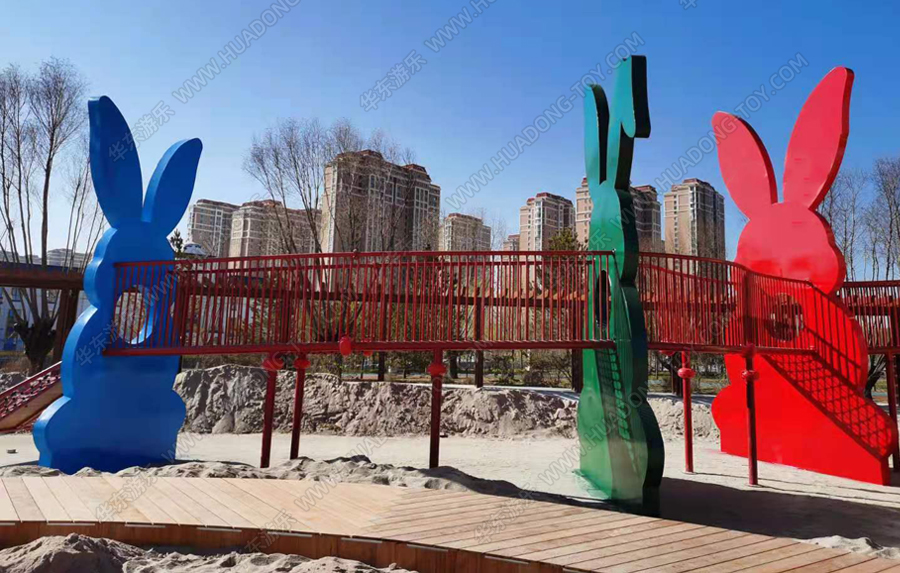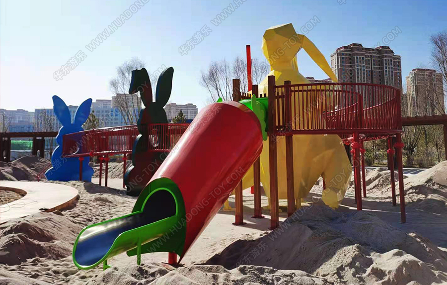 兔子乐园非标定制是银河游乐根据客户场地需求以及结合当地实际情况而设计的兔子主题乐园的游乐场,该游乐园具有主题鲜明,设计新颖,功能多样等特点,设计了滑梯组合、爬网、钻洞、沙池等游乐设备。
