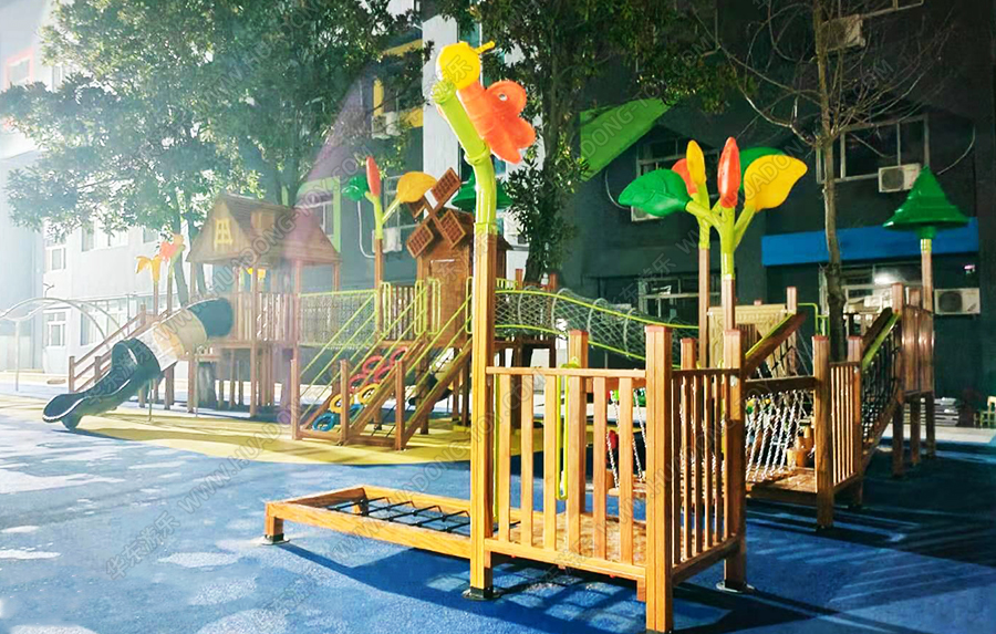 江苏省泰兴市育红幼儿园城西分校是经教育部批准的优秀幼儿园,该幼儿园此次采用的是银河游乐生产的木制系列产品,具有爬网、攀爬、滑梯、脚踏水车、传声筒、钻洞等游乐设施。