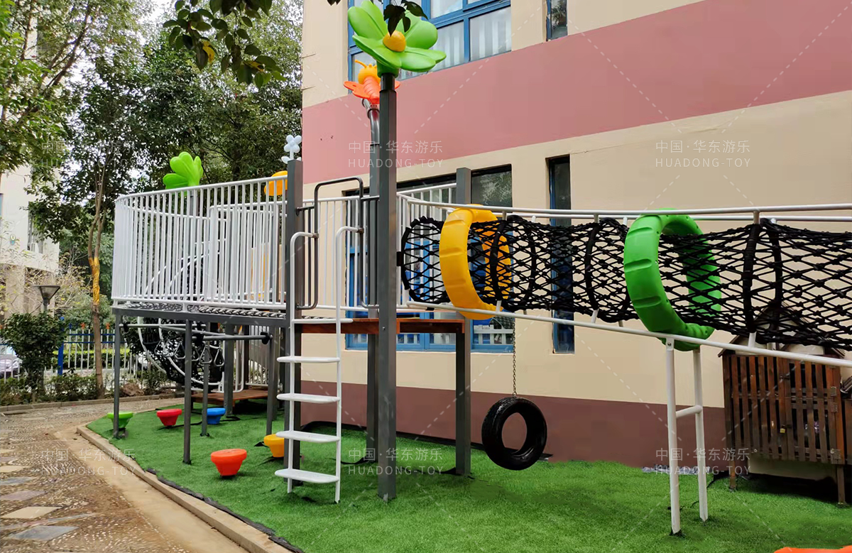 绿都幼儿园选用的是银河游乐自主研发的具有攀爬、滑梯、爬网、钻洞、葫芦攀爬为一体的综合性游乐设备。