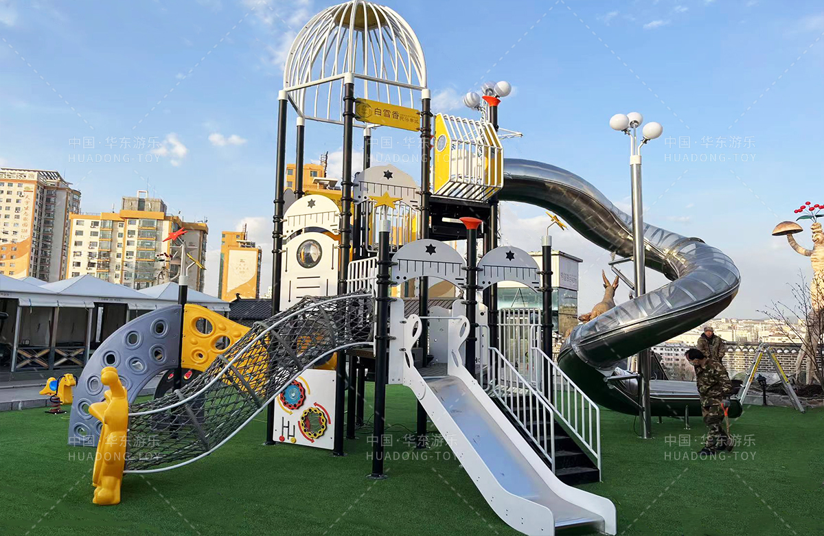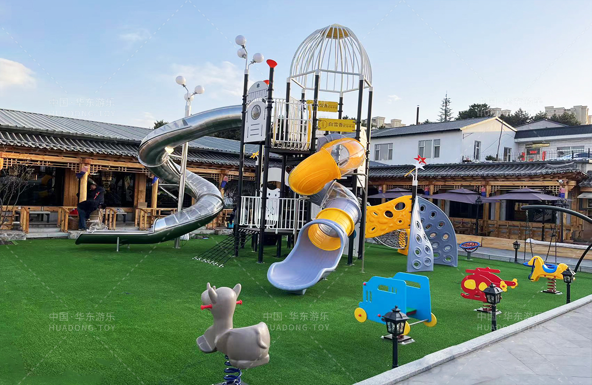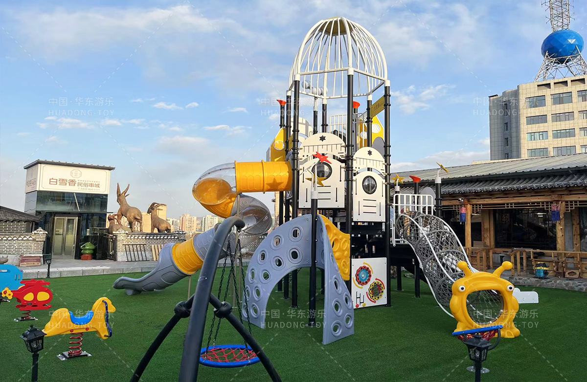 吉林省白雪香民俗烧烤城是一个专业的休闲夜宵烧烤城,此次选用的是银河游乐自主研发和设计的 PE板系列滑梯,卡通的造型,齐全的功能深受小朋友们的喜爱,同时还设置了小朋友喜欢的儿童摇摇乐、组合秋千、 旋转碗等游乐设备。