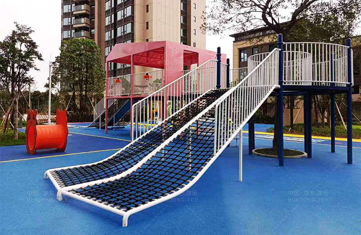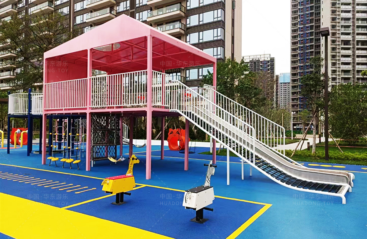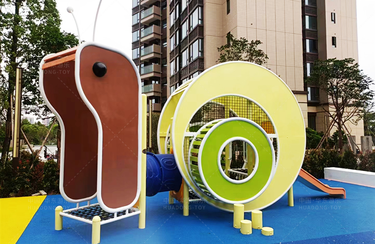 该房地产选用的是银河游乐设计和生产的非标定制系列的游乐设备,分别设置了跷跷板、摇摇乐、钻洞、传声筒、蜗牛主题组合滑梯,以及具有钻洞、攀爬网、攀爬绳、攀爬梯等功能为一体的空中小屋的游乐设备,该游乐园的建设不仅仅丰富了小区人们的休闲生活,还为小朋友提供了一个休闲、娱乐的场所。