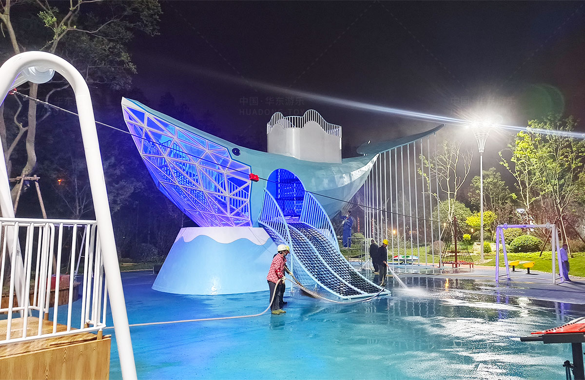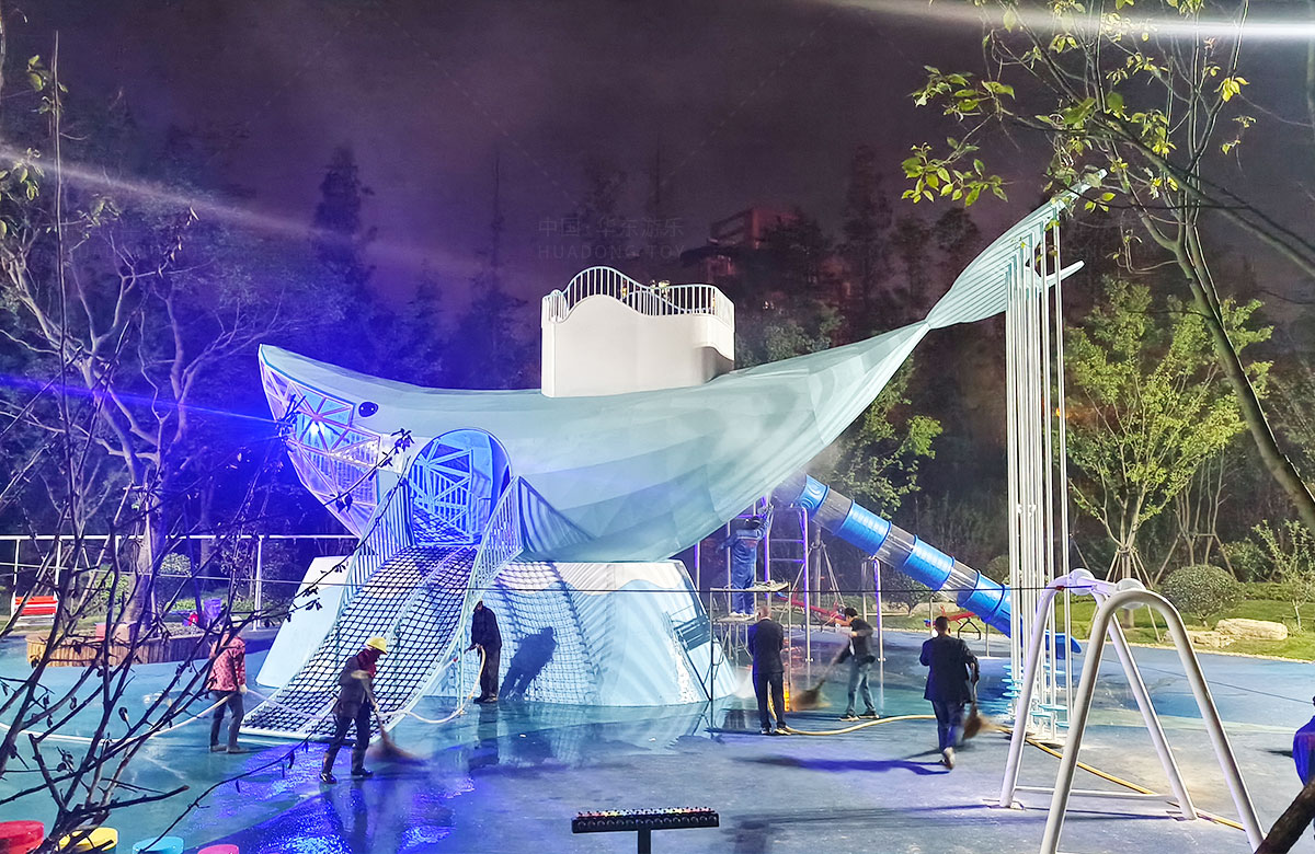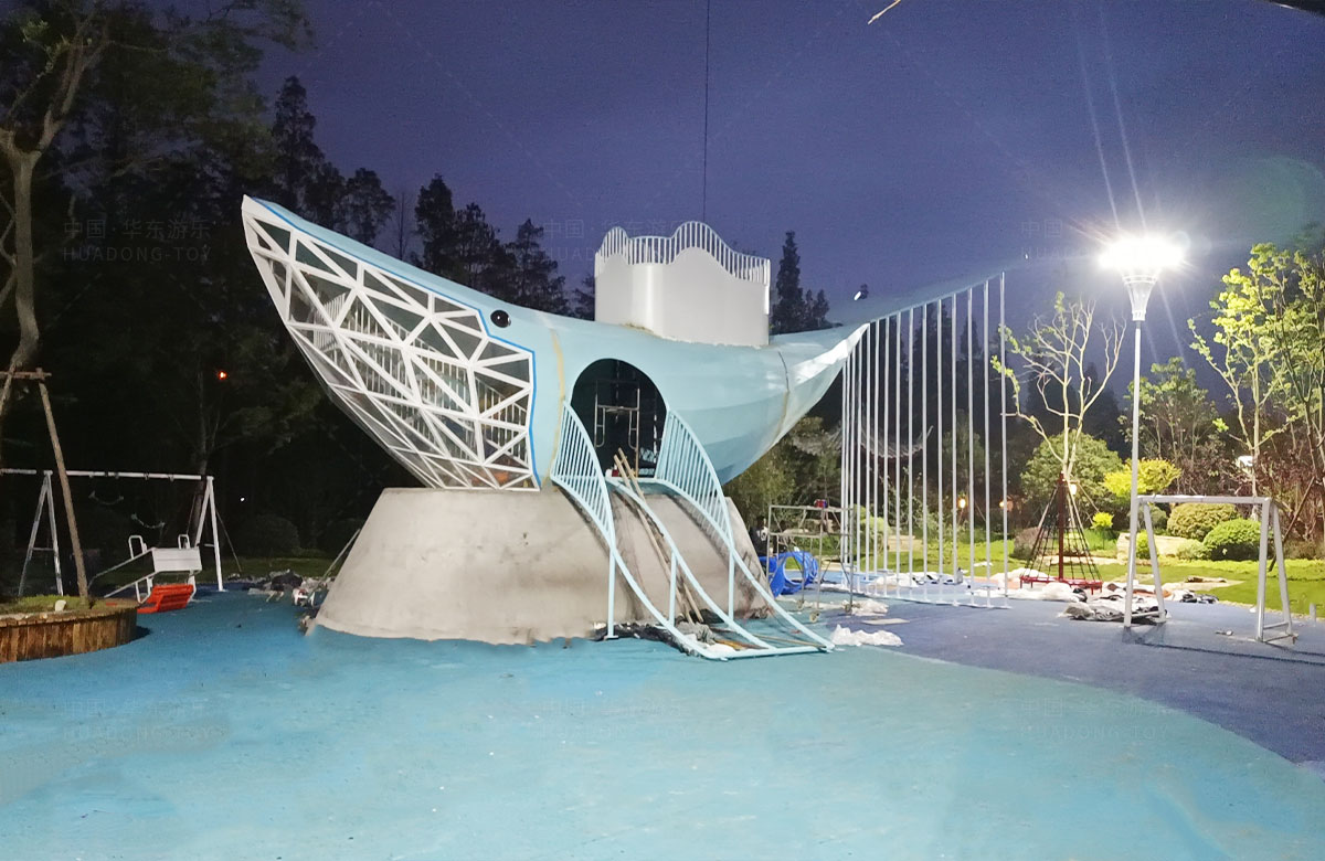 该项目选用的是银河游乐自主研发和生产的鲸鱼主题系列的非标定制游乐设备,设计了具有攀爬网、钻洞、空中滑索、打击乐器、旋转椅等功能设备,卡通的造型,完善的功能深受小朋友们的喜爱。