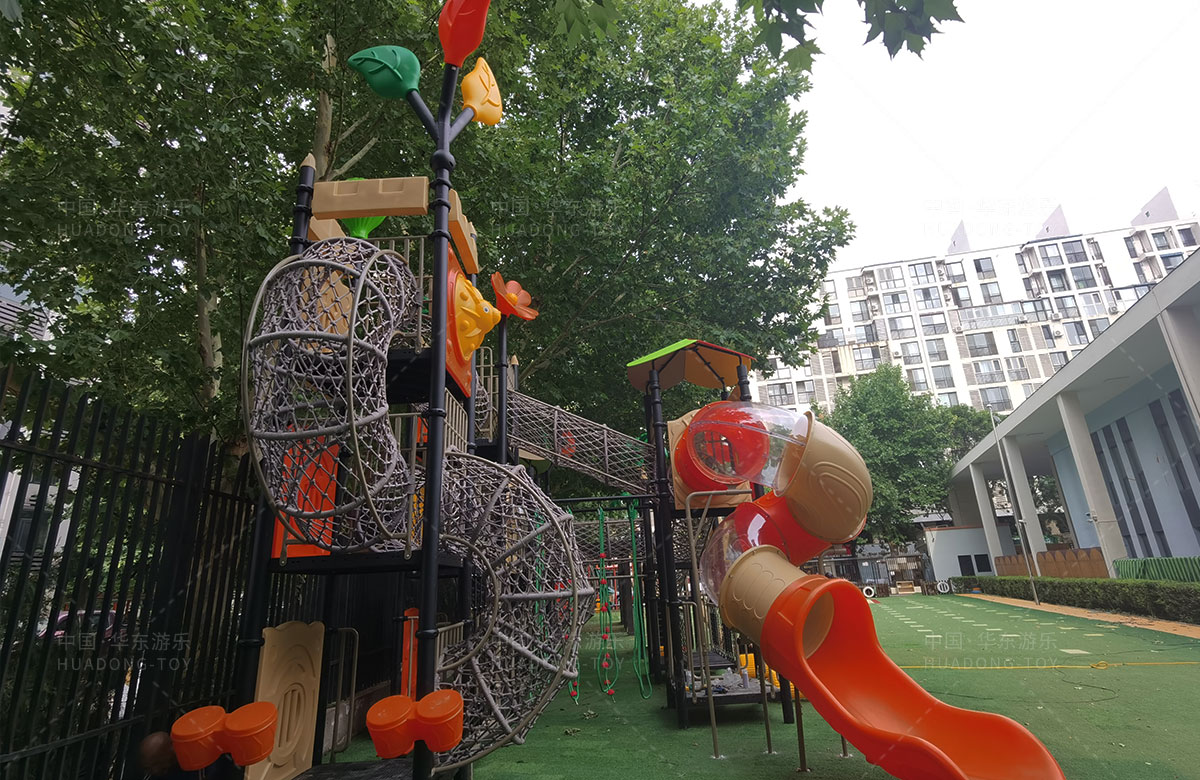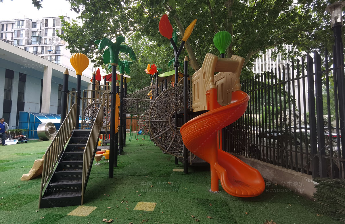 北京市朝阳区管庄忠德幼儿园选用的是银河游乐自主研发和设计的大自然系列组合滑梯,该滑梯是一款具备了攀爬网、钻洞、滑梯、丛林拓展、拍拍鼓、攀爬墙、固定踏踏车、平衡桩等功能为一体的综合性 游乐设备,能够很好的锻炼小朋友的全面发展。